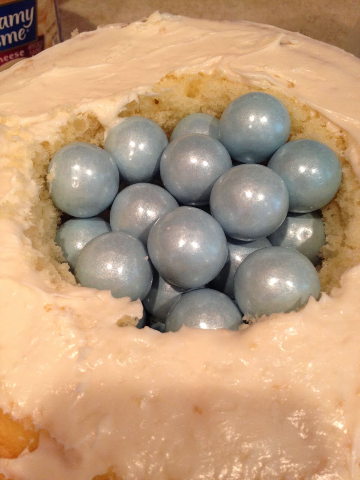 While he went to scouts that night, I made a cake! The goal is to have a hole in the middle filled with candies the color of the baby's gender. I found the recipe on Betty Crocker.